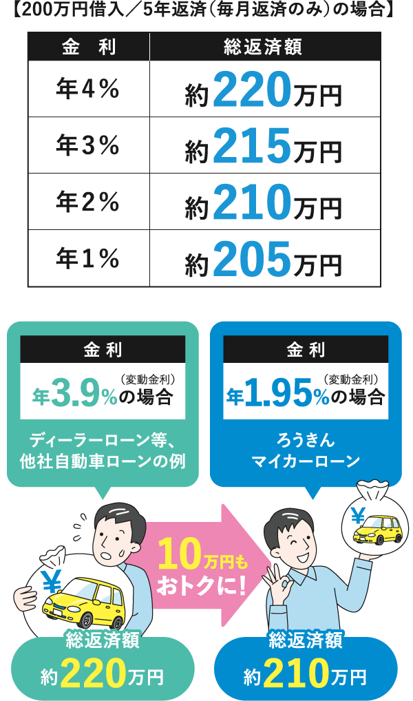 今までディーラーローンを借りていましたが、ろうきんで借換えをして毎月の余裕が生まれました。